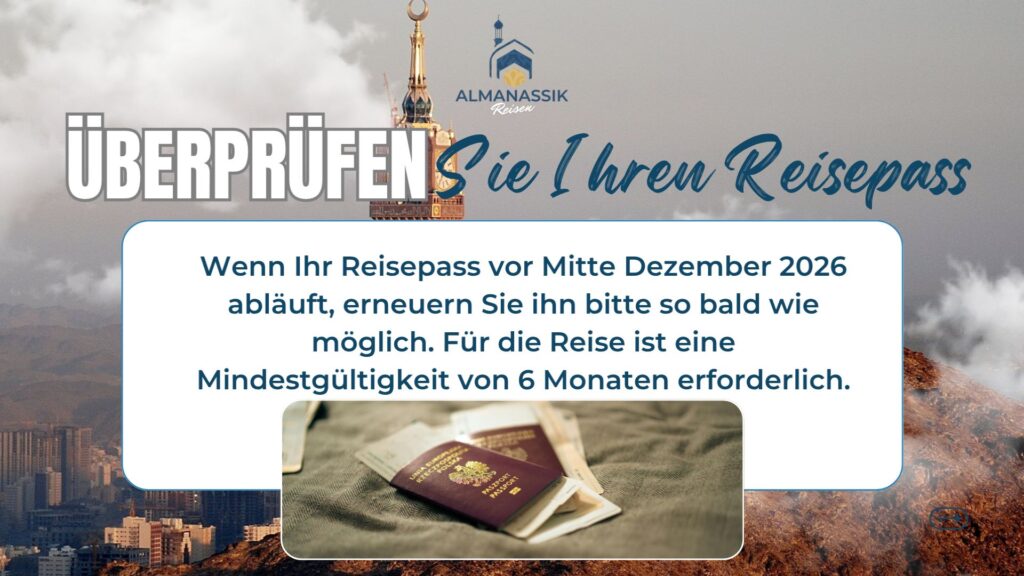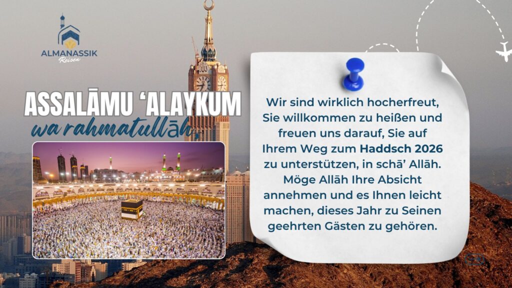 🕋 Assalāmu ‘alaykum wa rahmatullāh, Wir heißen euch herzlich willkommen auf unserem Kanal und freuen uns, euch auf eurer Reise zum Haddsch 2026 zu begleiten, in schā’ Allāh. 🤍 Möge Allāh eure Absicht annehmen und es euch leicht machen, in diesem Jahr zu Seinen geehrten Gästen zu gehören. 🌿✨ So könnt ihr euch jetzt vorbereiten: 1️⃣ Erneuert eure Absicht (Niyyah) – Bereitet euch mit Aufrichtigkeit und spiritueller Ruhe auf diese gesegnete Reise vor. 2️⃣ Überprüft euren Reisepass – Wenn er vor Dezember 2026 abläuft, erneuert ihn bitte bald. Mindestens 6 Monate Gültigkeit sind erforderlich. Dies ist erst der Anfang – wir werden regelmäßig Updates, Erinnerungen und spirituelle Impulse teilen, um euch auf jedem Schritt zu begleiten. 📌 Bleibt dran & folgt uns, damit ihr nichts verpasst! 🌙 Haddsch2026 Hajj2026 AlmanassikReisen Pilgerreise Islam Mekka Medina HajjPreparation MuslimTravel SpirituelleReise HadschDeutschland UmrahUndHaddsch HajjJourney Nusuk HajjTipps PilgerSpirit