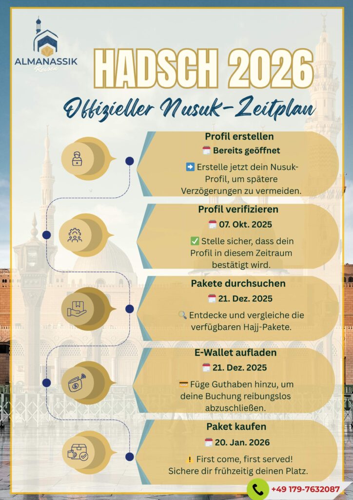 Home Hadsch Reisen Hadsch 2026 – Offizieller Nusuk-Zeitplan Hadsch Reisen Hadsch 2026 – Offizieller Nusuk-Zeitplan 2 FacebookTwitterPinterestWhatsApp
